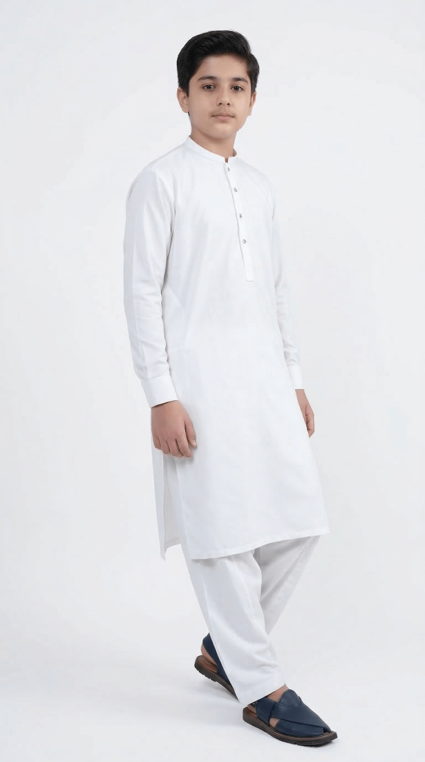 This elegant White  Boys kameez Shalwar is designed for a classic and refined look.